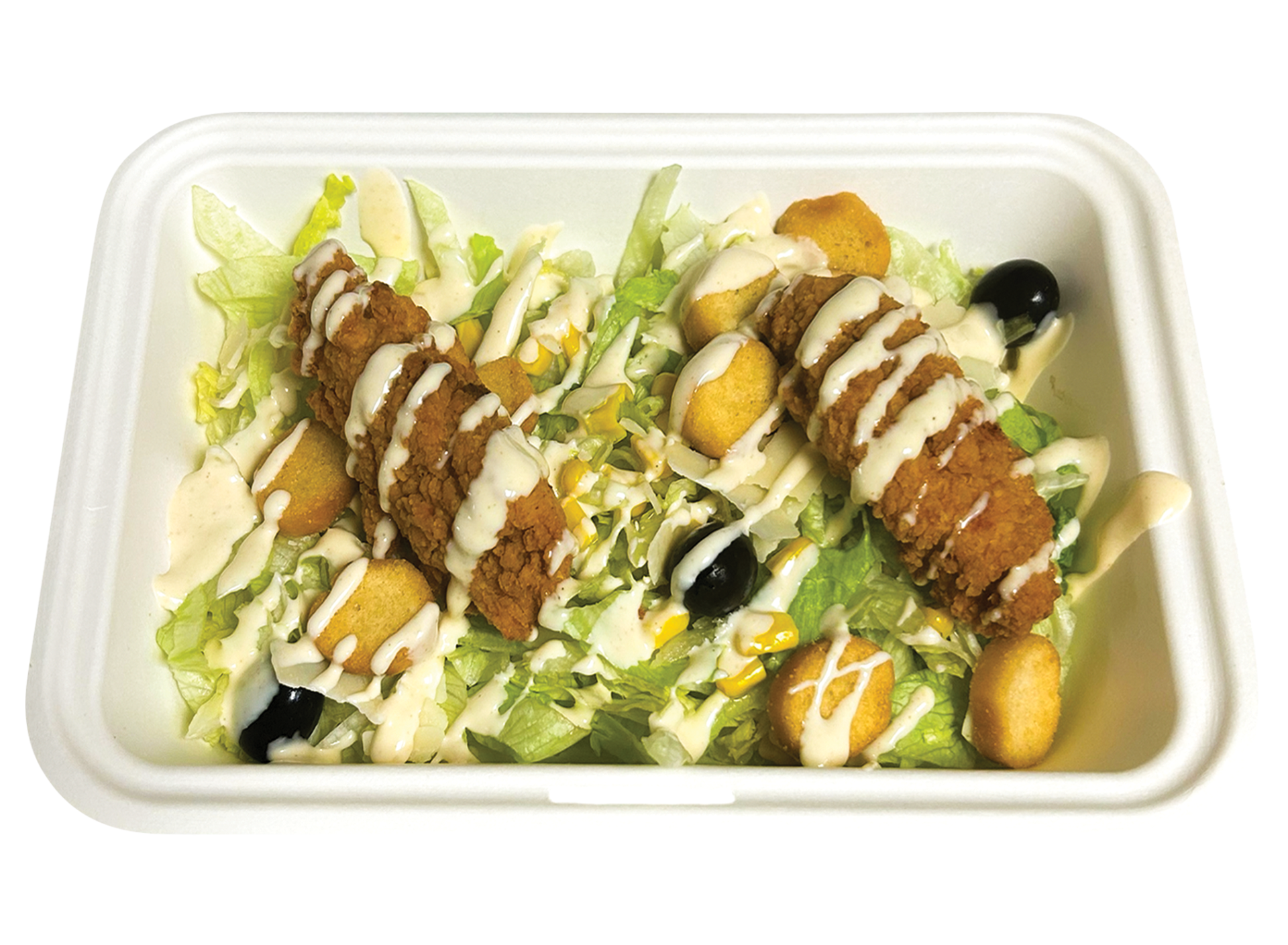 Salade, maîs, tomates , poulet pané, croûtons, copeaux de parmesan, sauce César